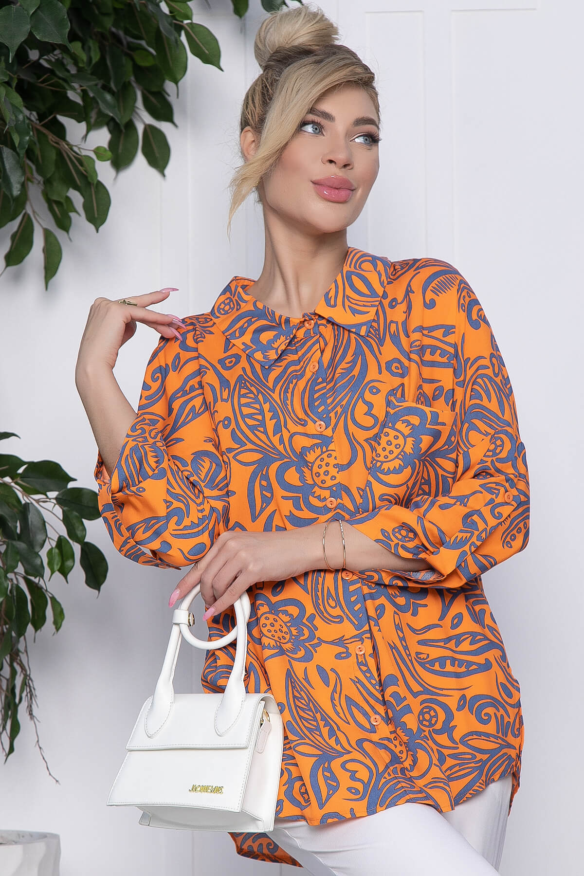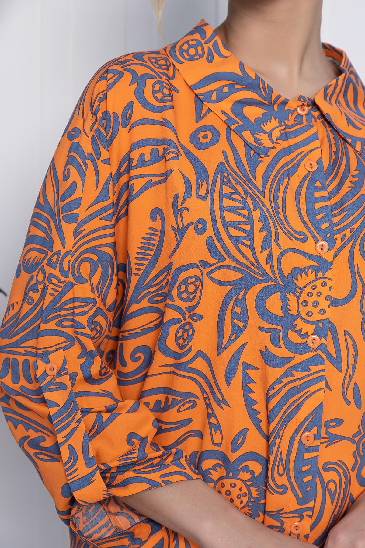 Лёгкая рубашка свободного кроя с акцентной спинкой. Классический отложной воротник по переду, по спинке украшен цепочкой серебряного цвета. Такая рубашка подойдёт для создания стильного летнего образа и будет гармонично смотреться в сочетаниях с джинсами, шортами и брюками.