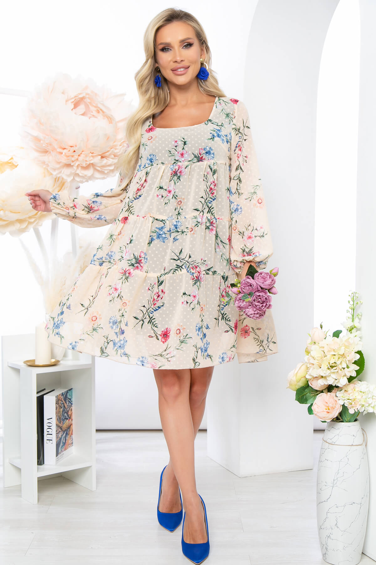 Платье из шифона свободного кроя, на подкладке. Рукав втачной, длинный, низ на резинке. Юбка состоит из ниспадающих воланов, талия завышена.