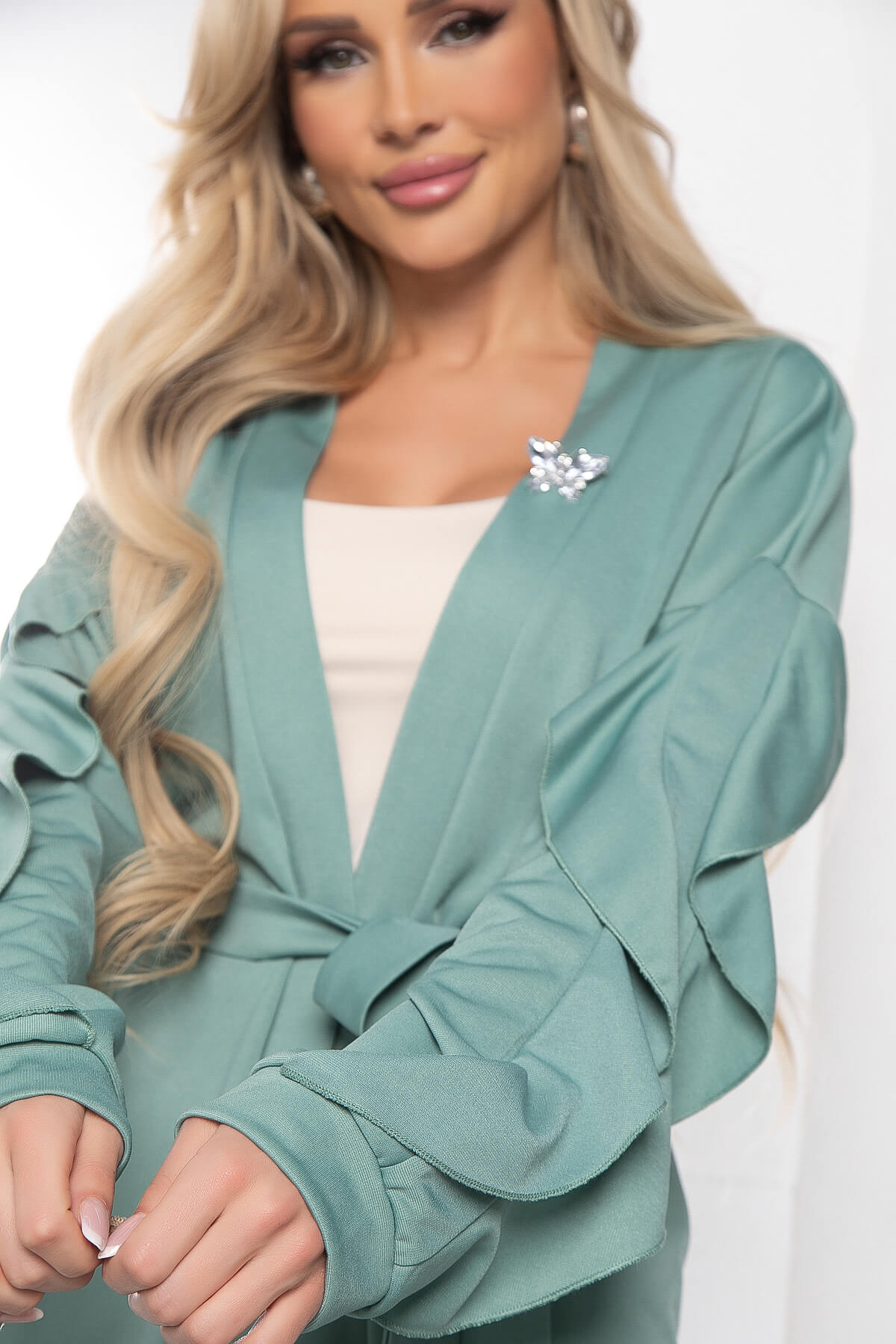 Жакет из трикотажной ткани создан, чтобы сводить с ума окружающих от вашей ослепительной красоты! Изделие украшают акцентные декоративные рюши на рукавах. Жакет OVERSIZE, что позволяет скрыть недостатки фигуры и подчеркнуть ее особенности благодаря поясу, который идет в комплекте. Идеальный выбор на праздничный вечер. В комплект входит брошь "бабочка".